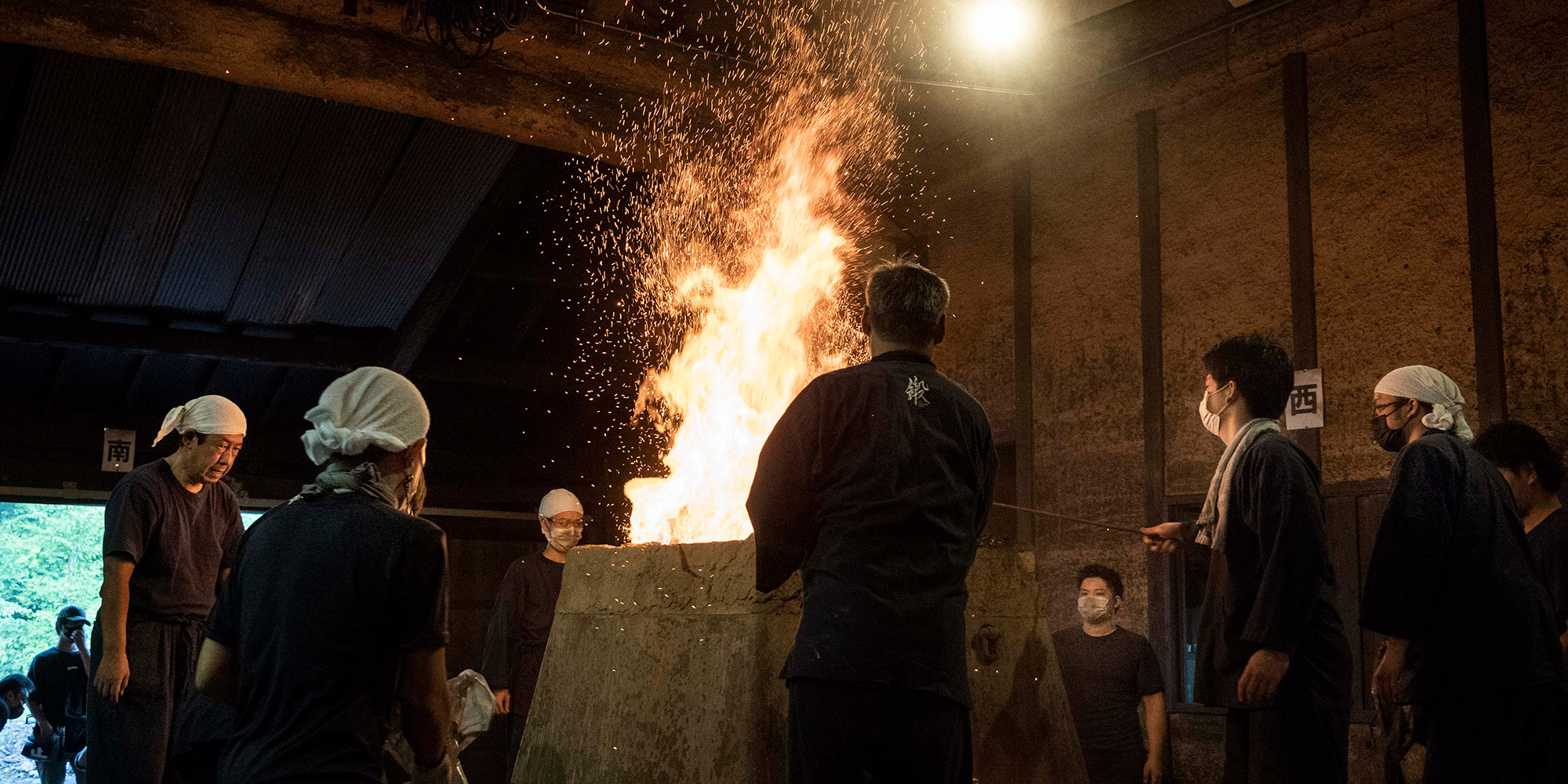 砂鉄と木炭を燃焼させて鉄をつくりだす日本古来の製鉄法を「たたら製鉄」といいます。日本刀の素材となる玉鋼などはこの製鉄法でしかつくることが出来ません。