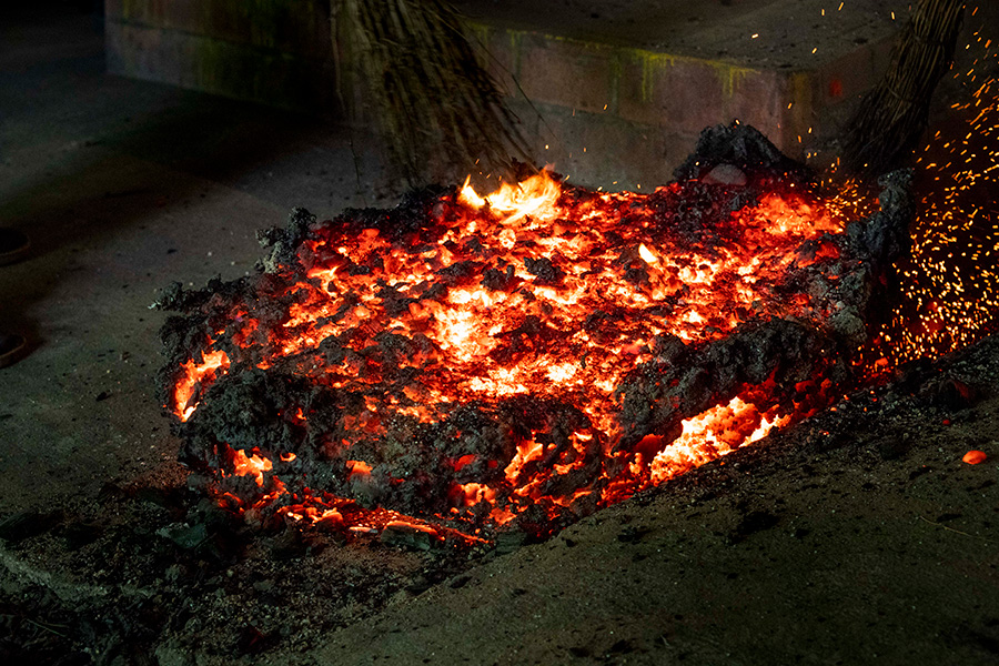 たたら製鉄では木炭を燃やして砂鉄を還元し、鋼(はがね)や銑(ずく)、歩鉧(ぶげら)を生産します。1回の操業では開始から終了まで三昼夜掛かります。1操業は一代(ひとよ)と呼ばれ、田部家が経営した菅谷たたら(雲南市吉田町)では、一代で砂鉄を約12トン、木炭を約13トン投入し、約3トンの鉄塊(鉧)を生産したといわれています。たたら操業は年間に60~70回行われていました。