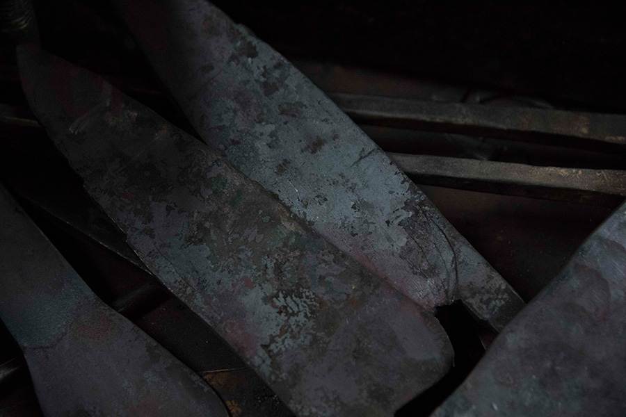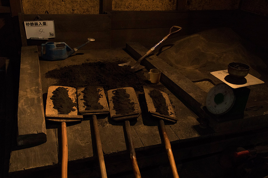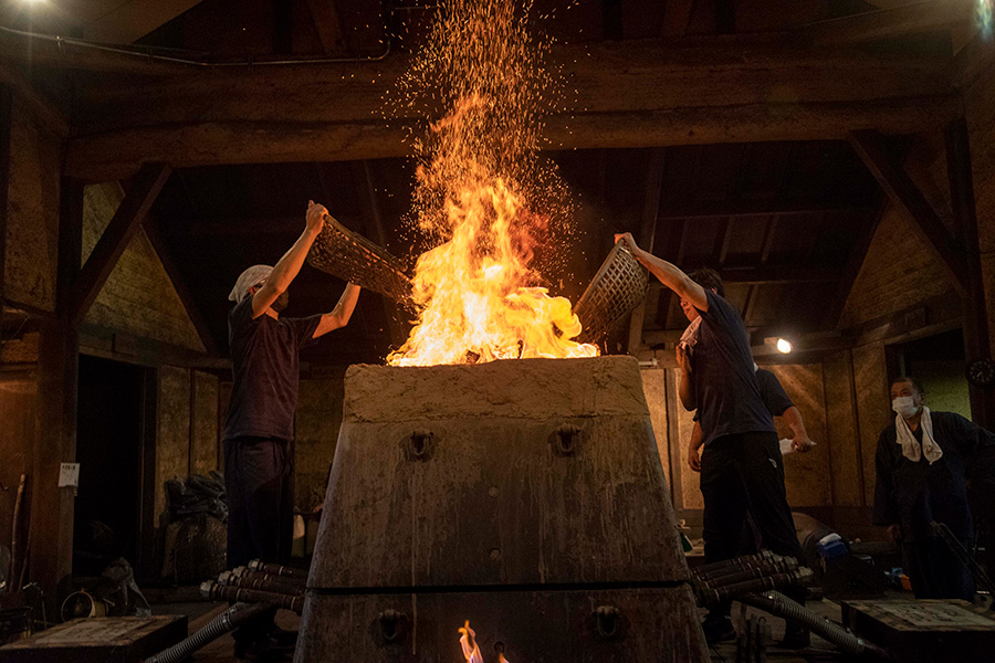 たたら製鉄の技術責任者は村下と呼ばれています。村下は操業時に司令塔の役割を担っており、砂鉄の投入量や送風量などの全てを取り仕切ります。長年の経験により培われた技は代々受け継がれてきました。