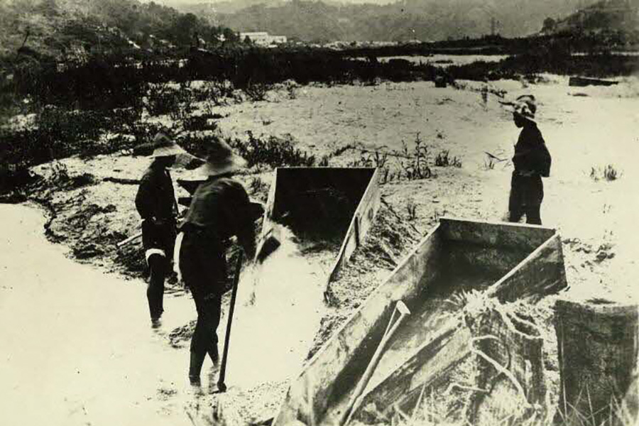 中国山地では、原料となる良質な砂鉄(山砂鉄)を含む花崗岩が広く分布していたことから、山を切り崩して砂鉄混じりの土砂を水路へ流し込み、砂鉄選鉱場で砂鉄と土砂の比重の違いを利用して砂鉄を集める鉄穴(かんな)流しと呼ばれる手法で採取されました。また、燃料となる木炭は鉄師(たたら経営者)が所有する広大な森林から生産することが出来たことから、江戸時代後期から明治時代初頭の最盛期には鉄の一大産地として国内鉄生産量の9割近くを占めたといわれています。